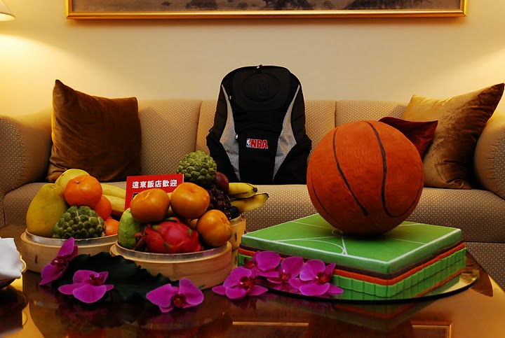 *遠東飯店特別製作籃球、球場蛋糕,以及搭配台灣珍貴的水果特產,做為迎賓佳禮。