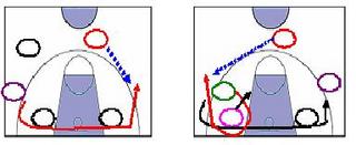 火箭隊而也有幾球則是如右上圖,綠色圓圈的Shane Battier,利用紫色圓圈的Luther Head如黑色箭頭所指走位做深切為晃子;然後實際是如右上圖的紅色箭頭所指,用單邊堆砌(stack)的捲曲切(curl cut),最後如藍色箭頭所指,接紅色圓圈Alston的傳球而攻擊。這個戰術還衍生出在低位做空手和空手掩護(off ball screen),那個粉紅色圓圈的姚明,藉由Battier的切出掩護,如黑色箭頭所指切出接Battier的傳球攻擊。這個戰術,今天也出現另一種姚明和Battier的2人組合(two man game);以Battier的3分線能力,後續各隊恐怕有苦頭吃。
