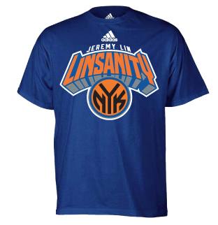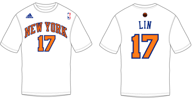 adidas將於三月份發售的林書豪官方授權T恤,包括adidas林書豪紐約尼克隊主場T恤,設計與林書豪在紐約麥迪遜花園廣場出賽時所穿著的白色主場球衣完全相同,正面印製了NEW YORK球隊名稱與他專屬的17號背號,背面則有他的姓名LIN與偌大的橘色背號。