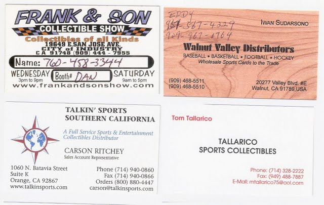 在我12歲的那年,由於祖父母移民美國,因此我每年的寒暑假都是在美國度過的,那時候的我心裡面只想著我的球卡,這兩年來我也慢慢的對於球員跟NBA認識許多,再加上英文的進步,使我對於球卡的喜好有增無減。那時我的堂弟(跟我差五歲)被我帶壞,同樣的對於球卡是愛不釋手(可能我們是同月同日生的雙魚吧,所以興趣一樣XD),叔叔跟祖父母拗不過我們,也只好配合了,除了零用錢上的支援,叔叔也開始搜尋哪裡有”Card Show”(註一),一旦有消息了週末的時候就會前往,經過幾次的尋覓,我們終於找到我日後最大的樂園,位於加州洛杉磯City of Industry, Fairway Dr跟E.San Jose Ave的交岔口上的Frank & son’s Collection Show. 它是一個市集式收藏品交易市場,在一個很大的倉庫裡面有大約200-300個攤位,舉凡漫畫,唱片,玩具,以及其他各式收藏品,裡面都有專門的攤位在賣,那時大約有1/4強的攤位是賣球卡的,對於我這個球卡界的菜鳥來說,真的是大開眼界。