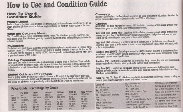 Service) 這個我們稱之為鑑定卡服務,鑑定什麼呢?真假?還是年份?還是什麼其他的嘛?其實以上說的都有包含,卡的真假,假卡他會不收的,年份,你如果不知道你卡的年份,鑑定完畢之後在卡上方的部份份有一個小紙片說明卡的身分的。但是鑑定最主要的部分是鑑定卡的品相。它由四個部分來鑒定Centering球卡圖片是否正置當中,Corners卡片的四個角是否有損傷,Edges卡的邊邊裁切是否整齊有無掉漆,Surface卡片表面是否乾淨是否有磨損。每個項目由1-10分來分級,分數越高代表品相越好,然而也可以有越高的價值,當然鑑定完畢Beckett會幫你把卡片用一個塑膠殼保護起來,並且附上一個評分的小紙片,標明評鑑後的分數(也是1-10),而現在的簽名卡很多,所以球員簽名的筆跡跟墨跡也另外列入評分,而Beckett也會標註簽名部分分數。(也是1-10分)