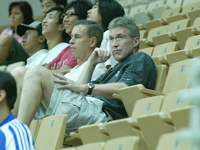 由於上周六(7月12日)我已錯失和前金塊助理教練,今年5月轉任職亞歷桑納大學首席助理教練Mike Dunlap交談的機會,一看到觀眾席又冒出兩位貌似球探的「阿逗仔」,我不想再錯過這次攀親帶故的良機。