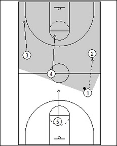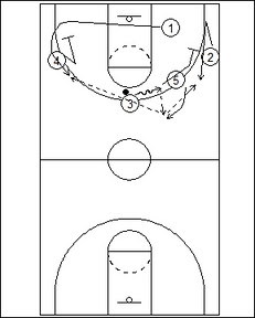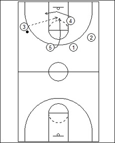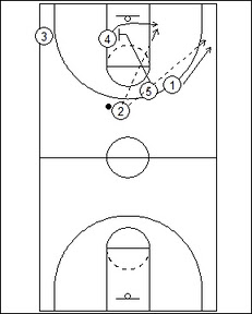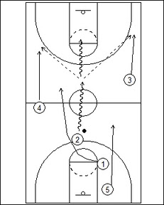 以北卡快攻這個系統來說,是一個可以很自然接續到急攻 (Early-Offense)的打法,有一說法是赫赫有名的北卡二次快攻就是一種急攻,對此筆者也算認同,畢竟急攻的概念就是接續在快攻不成之後的延續進攻,而這個進攻的精神是建立在對手即使將停球這個動作作的夠好來擋住快攻,整體的防守陣型卻還來不及擺好下,迅速執行一波快速進攻來打對手一個措手不及的,要將北卡二次快攻歸類成急攻也不是不可;講回北卡二次快攻本身,這個方式的重點在將執行拖車進攻的球員多賦予了後掩護的要求,讓整個快攻體系有更多的延續性,先介紹兩種基本作法(圖五、圖六):