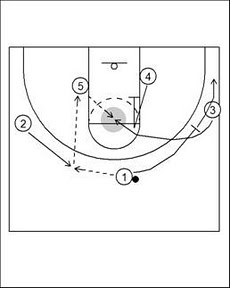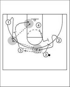 這則是一個比較強調強弱邊轉移的複雜的變化型式,1號先傳給2號,2號再傳給利用5號的掩護空手切過來的4號,5號則是繼續移動作第二次單擋,替3號掩護令其得以切到強邊接球,2號在傳完球後馬上往禁區作幅度較大的深切,並同時利用4號與5號兩個人的反擋,由禁區內切出到弱邊,球再從強邊經過兩次傳球快速轉移到弱邊來完成進攻。