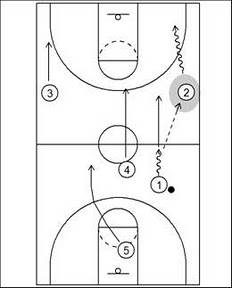 這是一個接續快攻後的延續性進攻系統,是一個有套路的急攻(Early-Offense);控球員接獲傳球(不論是搶到籃板後的轉換快攻或是被進球後的底線發球),快速將球分給已經往前場推進的2號球員,2號球員接球後可以第一時間作投籃或切入,這是第一個進攻選項;要是對方退防的夠快,則可以如第二個圖所示:第一選擇是接4號球員的拖車快攻或是傳給由另一側弱邊利用5號球員掩護切出的3號球員來進攻;萬一3號球員接球後還是沒有機會下,則可以如最後一個圖所示:作反擋掩護來進攻(一共兩次,第一次:3傳5,3替2擋,由2作進攻;第二次:5替1擋,2傳1,由1作進攻);或是將球傳給作Pick-n-Roll拆進籃下的5號球員作進攻,簡而言之,快攻不成下自然接續到急攻後,不順利就以Pick-n-Roll作結尾,再接續到三人或兩人小組的機遇戰or半場系統戰。