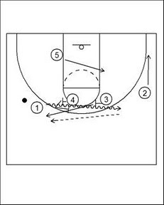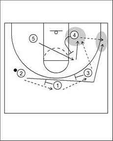 這是一個建立在Motion-Offense上的戰術,45號球員分別作下擋(Down-screen)替3號球員作掩護,控球員待過半場之後就可以第一時間給球,讓3號球員執行單打,要是沒機會的話,5號球員會在掩護完之後繞底,利用弱邊的2號球員的掩護取得在禁區接球單打的機會。