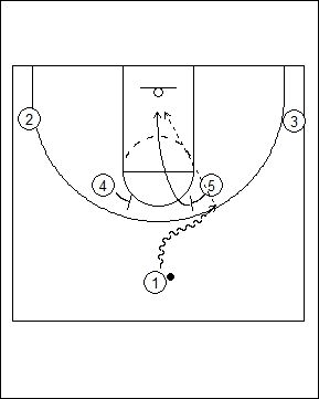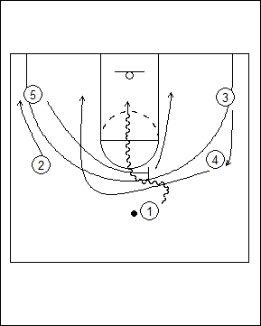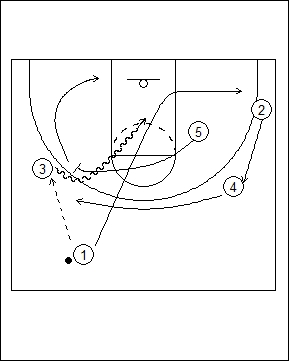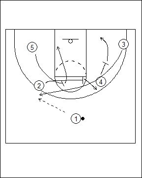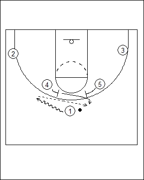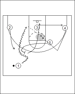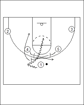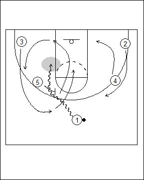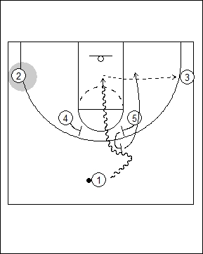 首先藉由一個簡單的後掩護將機會作給拉到底角的二號球員,掩護完的中鋒或大前鋒馬上填補拉到內線以維持四角落位;一但底角的持球者沒機會出手則五號球員再度上前作PnR開啟第二波進攻,一號立刻切走到弱邊底角埋伏,其餘兩人依補位原則填補空位。