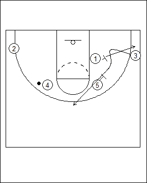 首先由四號替三號球員作下擋掩護,後續再由五號及二號替其在高位設立Cross-screen,掩護完一律依補位原則填補空位維持四角落位(有拆到內線的也有Pop-out到外線的,都是有機會就可以傳球作進攻的選擇),連續利用到三個單擋掩護的二號球員接球後有機會就可以自己處理球或是接PnR又或是將球交回給控球員重新發動進攻。
