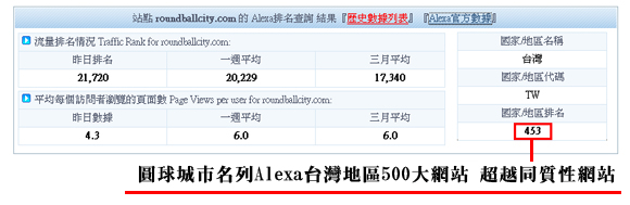 全球排名系統Alexa分析出《圓球城市》平均每個訪問者瀏覽的頁數為6.0(頁),以及《圓球城市》目前為台灣前500大之內的網站,在同質性網站中獨占鰲頭!