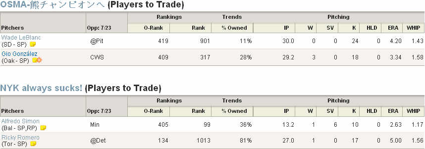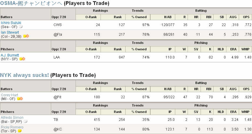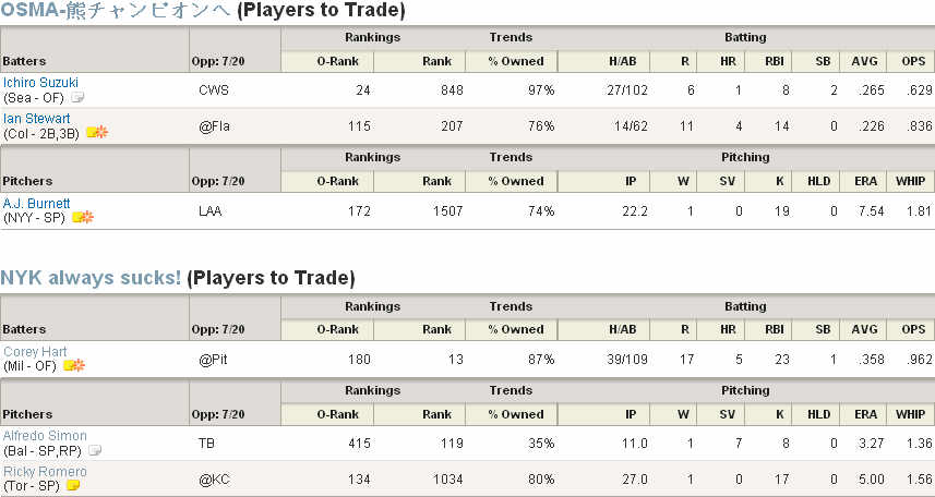 大大們好, 小弟上來報告一下, 紐約隊的隊長最近似乎非常忙碌, 出現很多次沒有更新陣容的情形, 加上捕手和一壘手傷兵遲遲的沒有處理, 令人無法想像這位大大有心在FB上, 偏偏紐約客大大又和小熊大做交易, 而且看來是吃虧的(將表現不錯的Hart和CL Simon 拿去換表現沒那麼好的一朗和2B3B的Stewart, 另外相對穩定的Romero拿去換爆很大的Burnett, 不管整季或單月表現都勝過對方, 怎麼看都不划算), 讓人不懂紐約客大大的用意!