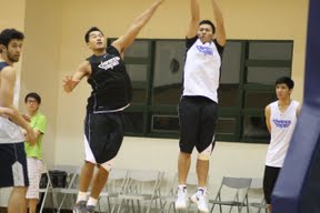 首先剛開始的重點在一些Motion的兩人與三人的小組配合式練習,從這裡可以看得出來Bob.Hill教練十分重視由小細節做起再揉合整體的訓練原則,演練了以單擋、反擋、雙擋或後掩護加上V-CutCurl-CutI-CutBack-Cut、Shallow-Cut等空手跑位方式與搭配Pick-n-RollGive-n-GoMotion-Offense的基本元素為開場,後續也加上了練習全體五對五跑動的完整Motion-Offense