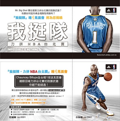 史上首度NBA台北賽8日登場,NBA指定運動品牌的adidas將於7日邀請到丹佛金塊隊的當家後衛Chauncey Billups與台灣球迷碰面!從明天(6日)晚上6點開始,球迷們可前往於新光三越A11 4樓adidas專櫃索取「我挺隊」 Chauncey Billups「唯1見面會」門票,每人限取2張,送完為止。「唯1見面會」活動現場,Billups也將抽出多位幸運球迷,親自邀請參加觀賞NBA台北賽!
