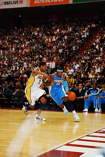 這場比賽,金塊隊一反在台北賽時的被動,從一開局就壓著溜馬隊打。但是跟台北賽最大的不同是:裁判吹得太兇了。溜馬隊全場被吹了41次犯規,Danny Granger才打9分多鐘就四犯,而且還兩次技術犯規被吹出場。溜馬隊讓金塊隊全場罰了55球之多,裁判的吹罰顯然讓比賽的精彩度下降很多,不過金塊隊也得益於此,才贏得勝利。Melo上半場就攻下28分,顯然是決定勝負的關鍵因素。Melo在賽後說:「今天來這裡就是要大幹一場。」是的,他做到了。