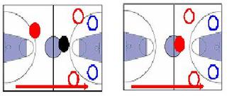 打這個戰術,基本上,雙箭頭要和控球後衛有些默契,要點有三。一,控球後衛在即將進入前場時候,就要發號司令(如下左圖的紅色實心圓圈位置)。你控球後衛,千萬不能已經帶球進入到前場了,才要告訴其他隊友要打什麼戰術(如左下圖黑色實心圓圈位置)。一則,假如對手掌握你們的戰術,雙箭頭兩翼球員(wing player;指2號得分後衛與3號小前鋒的通稱)很容易被阻絕(deny),以致難以接獲傳球而進行UCLA戰術;因為,只有雙箭頭的接應後,經過他這個戰術發起人的傳輸,戰術才能如意進行。