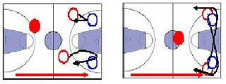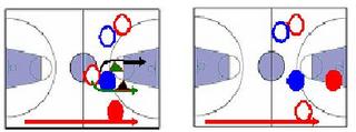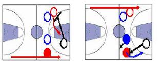 接著,假如戰術還不能如意執行,爵士隊採用的二種因應戰術是,這空手走位的控球後衛(如左下圖黑色空心圓圈)如黑色箭頭所指走到對邊去和隊友做橫擋(cross screen),然後讓隊友如紅色箭頭所指空手切去得球攻擊。另一後續戰術是如右下圖,藍色實心的圓圈內線球員,利用掩護後很快的如黑色箭頭所指,空手切到中線附近接應傳球;此時黑色空心圓圈的控球後衛,很快的如黑色箭頭所指移位到3分線外45度幫外圍隊友這個紅色實心、原來持球者做背向掩護(back screen),也就是做上擋(up screen),然後,這紅色實心的外圍球員就如右下圖的藍色箭頭所指,空手走位尋求空擋接球攻擊。
