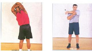 (五)肩關節:二手臂自然伸直下垂,開始時手臂由後以360度繞往前,這手臂連續往前繞一圈為1,然後接著連續繞2345678八拍共八圈,再連續由前往後繞1至8共八圈,接著由外往內做連續往內繞1至8共八圈,最後是由內往外繞連續往外1至8拍的八圈。