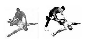 七、曲折跑:模擬空手走位的曲折跑步;注意改變方向的動作是,腳後跟砥住、腳尖馬上往另一方向蹬出;尤其蹬出有「速度與方向」的變化,也就是前面慢,要改變方向瞬間馬上急停快速走位。