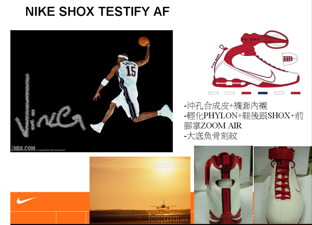 特色:Vince Carter & Shawn Marion 代言的明星鞋款,首度將優雅、行雲流水的zoom air 與狂野、爆發力十足的shox進行完美的結合,使Flight 飛人型球員在擁有爆炸性彈力優勢的同時,亦擁有絕佳的靈活貼地反應,還投近切無往不利。