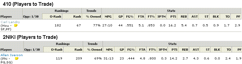 想不到AI真的如此墮落,現在居然LANDRY就能換了。(一方面,AI曾經是那個黃金一代中的狀元,幾屆得分王,MVP。另一方面,LANDRY只是火箭在選秀過程中用CASH買回來的一個二輪新秀。從出身和成就的角度看,一個天一個地。)AI靠“FANS”的支持,總算又進了一次ALL STAR,而LANDRY也有希望競逐最佳第6人。目前大家总算平起平坐,所以這交易就PASS啦。