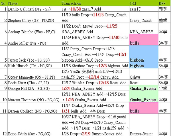 Abbey:Pau養傷時一定有一堆漫天殺價的鬼訂單出現,Abbey很有耐心的等待Pau復出,然後等待是值得的。不知道Andre Miller為什麼Ranking這麼低,但反已經被Abbey給掃地出門了。另外一個可惜的是Beno囉,要是多了那麼一點點耐心.....