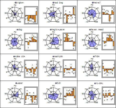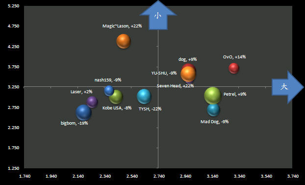 泡泡的面積大小,就是球隊品質的呈現 隊伍名稱後面的百分比為得分爆發力的表現, 正的是大於平均 , 負的是小於平均