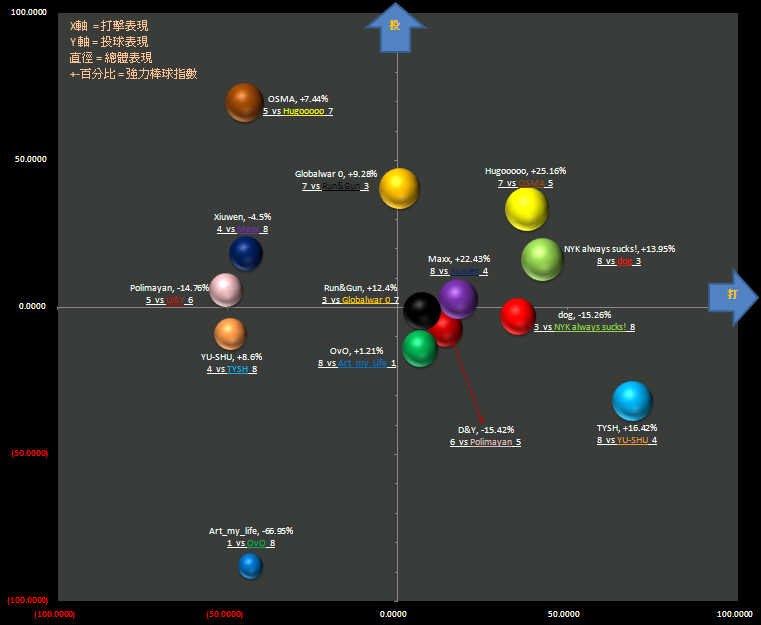 第9週          Hugo大大以打擊率 3成45 及平均每局上壘人數 0.83 刷新紀錄, 共有6項在本週稱霸